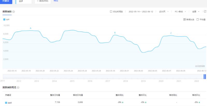 如果还是新手小白的话,那么建议先把前面部分看完,分布看了百度指数、微信指数、巨量指数,发现PPT模板的需求量非常大,并且看了最近几年的搜索量,数据量都一直非常稳定,有了这样的数据支撑,就能够确定这个项目能够做得很长久了,不是一个短期项目。