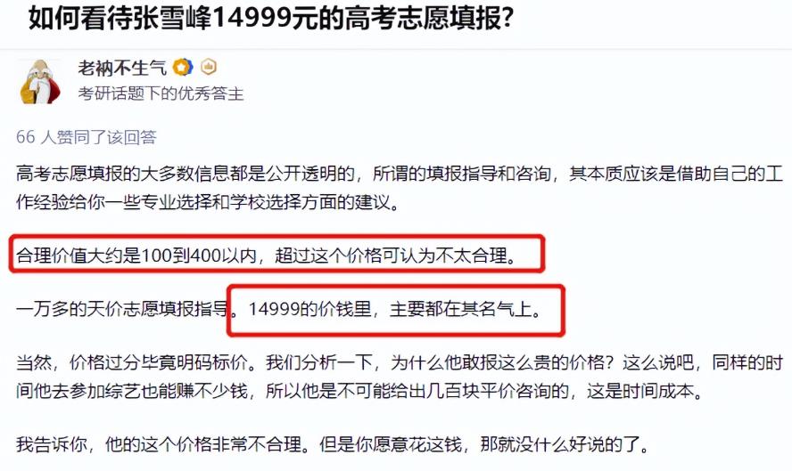 张雪峰针对志愿填报服务一次收费14999元,引起不少知友的观点。